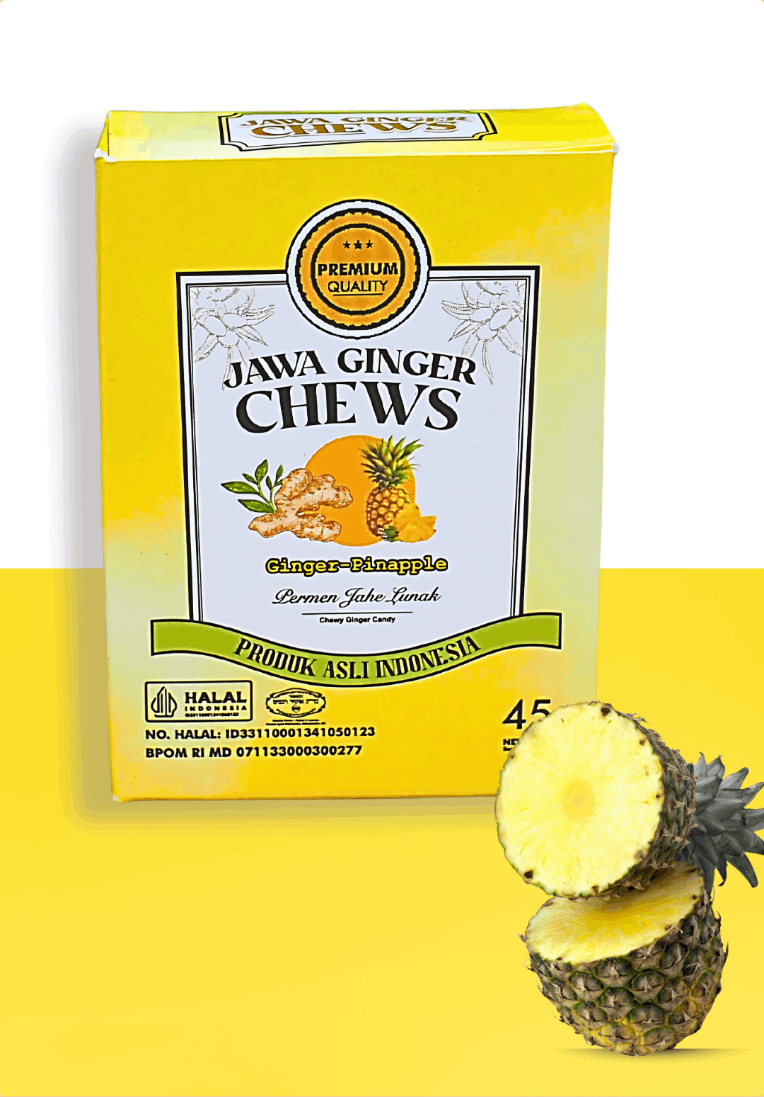 Varian yang menawarkan perpaduan rasa nanas yang sedikit asam dan tajam dengan kehangatan khas jahe. Nanas memberikan vibrant fusion atau sentuhan asam yang menyegarkan, menjadikannya permen kenyal dengan rasa manis, asam, dan hangat yang seimbang.